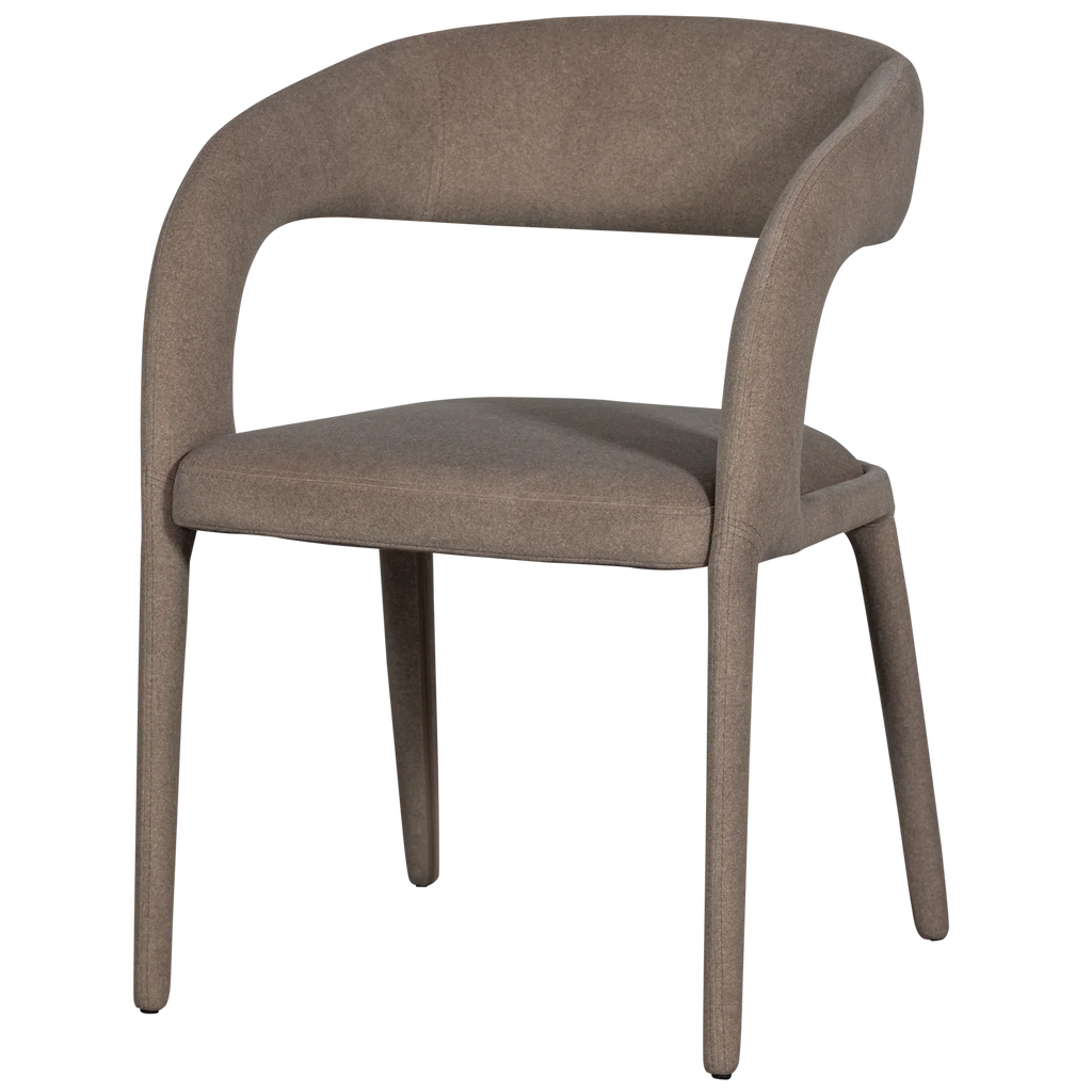 - Stylish dining chair with soft grip - Upholstered with a woven fabric (100% polyester) - Upholstered from head to toe - H 80 cm x W 60 cm x D 54 cm The Arms dining chair is from the collection of the Dutch brand vtwonen and has a sleek look. The dining chair is fully upholstered with a woven fabric with soft grip. This modern design ensures hours of after-dinner dining and should not be missing in your interior. Material Our Moza woven fabric has a soft grip and offers pleasant comfort. This compact woven fabric is made of 100% polyester and has a Martindale value of 100,000. The fabric stands out for its even coloring and felt-like look, providing a modern and stylish look. Dimensions - Height: 80 cm - Width: 60 cm - Depth: 54 cm - Seat height: 47.5 cm - Seat width: 42.5 cm - Seat depth: 46.5 cm - Leg height: 41 cm - Diameter legs: 3 cm - Width between front legs: 49 cm - Width between legs side: 45 cm (widest point) - Armrest height: 73 cm - Weight: 10.2 kg - Max. weight: 120 kg Maintenance Dab any stains dry immediately with a clean cloth or tissue. Do not rub! Most liquids can be removed with lukewarm water. Use a gentle circular motion from the outside inwards. If the fabric can be removed, it can be washed at up to 30 degrees. Stain Protection: For long-term protection against stains, the fabric can be impregnated. When using impregnation, the fabric can be treated with the iProteqt brand for optimal protection. This textile protector ensures that the furniture fabric is resistant to liquids based on oil, water and grease. It is recommended to do this as soon as possible after receipt to ensure instant protection. Delivery The item is delivered individually and fully assembled. Place felt protectors on the underside to protect the surface.