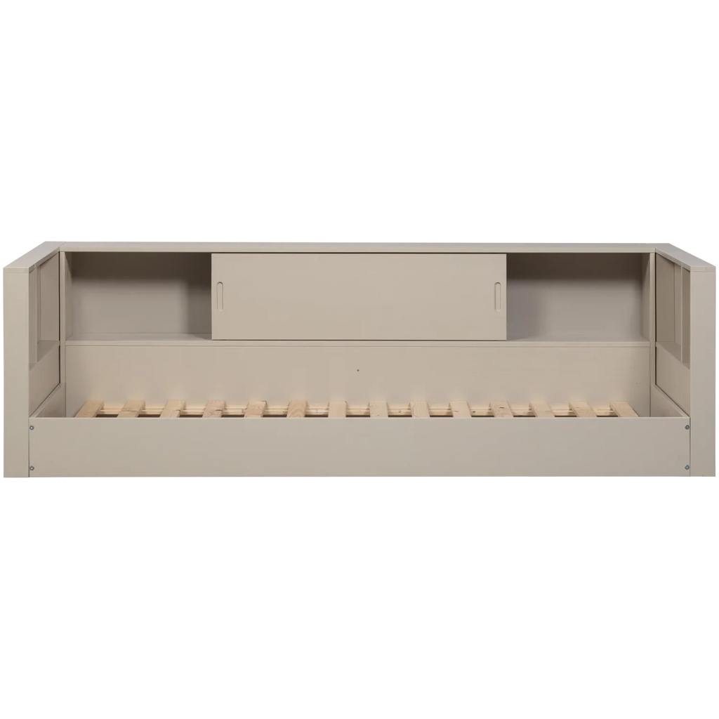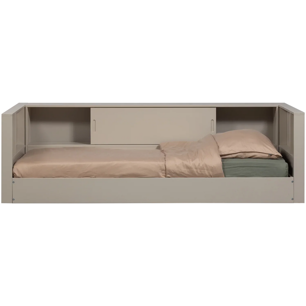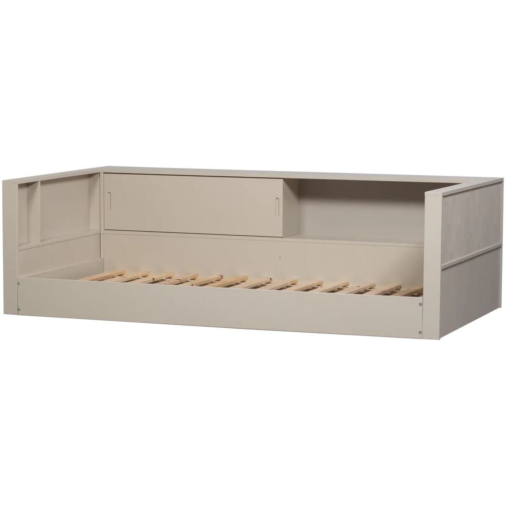 - Modern and timeless sofa bed - Made of pine in the color 'dust' - Contains storage space - H 67 cm x W 215 cm x D 118 cm This modern sofa bed comes from the collection of Dutch interior design brand WOOOD. The timeless design is enhanced by the practical storage option. The bed has a mattress size of 90x200 cm. The integrated storage space offers extra room for toys or other items, helping to keep the children's room not only neat but also cozy. A cozy, private place to dream away in endlessly. Our Carter sofa bed is a real asset to any children's room! Material The pine furniture in our collections is FSC-certified and comes from our own factory in the Netherlands . For example, our Carter series is sanded pine and therefore smooth and neatly finished. A light wood structure is still visible in the Carter series. This Carter sofa bed consists of a bed and two times a head and foot board which can be assembled as desired. Dimensions - Height: 67 cm - Width: 215 cm - Depth: 118 cm - Weight: 30.9 kg - Mattress size: 90x200 cm - Weight capacity: 150 kg Maintenance The pine items in our collections are treated with an environmentally friendly, water-based lacquer which significantly extends the life of the product. Treated pine wood is easy to keep clean with a slightly damp cloth. To avoid rings and spots in the wood, it is recommended to dry damp stains immediately. Delivery The article, excluding slatted base and mattress, is delivered in three packages and is easy to assemble using the supplied assembly instructions.