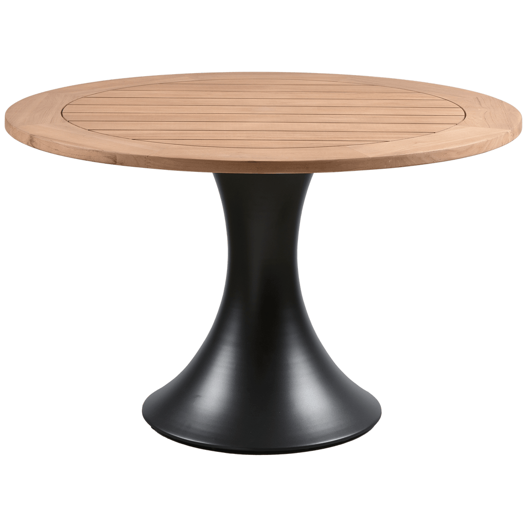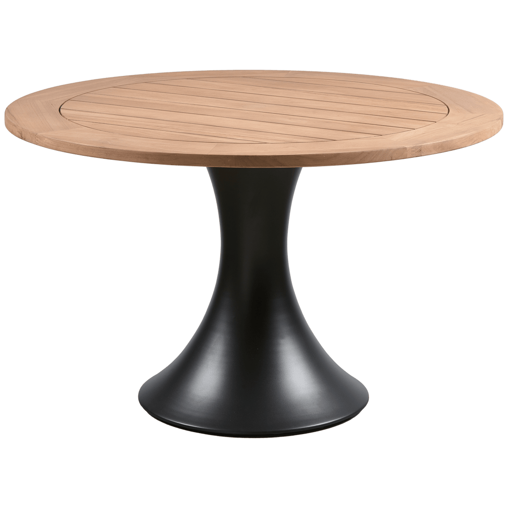 - Compact outdoor dining table - With a treated teak table top - Base made of dark-colored aluminum - H 76 cm x Ø 122 cm The compact Charley outdoor dining table, from the Exotan outdoor collection, is guaranteed to provide conviviality. The small table size easily accommodates 4-5 people, ideal for a patio or city garden! Outdoor Protect the furniture against hard rain, night frost and the winter period with a plastic film or protective cover. If possible, it is better to overwinter the furniture indoors. Material Teak wood itself has a dark brown/red color and is characterized by a tight, straight grain, making it very suitable for processing. However, when used outdoors, the teak wood may discolour or hairline cracks may appear in the wood. Dimensions - Height: 76 cm - Table top diameter: Ø 122 cm - Table top thickness: 3 cm - Leg height: 73 cm - Table leg diameter: Ø14/60 cm - Carrying weight: 150 kg Maintenance To keep teak furniture in optimal condition, it is advisable to maintain it regularly with the appropriate maintenance products. Do not clean teak wood with too much water, as this will cause the wood fibers to stand up and make the furniture very rough. Delivery The item is delivered individually in two packages. The table is easy to assemble using the supplied assembly instructions.