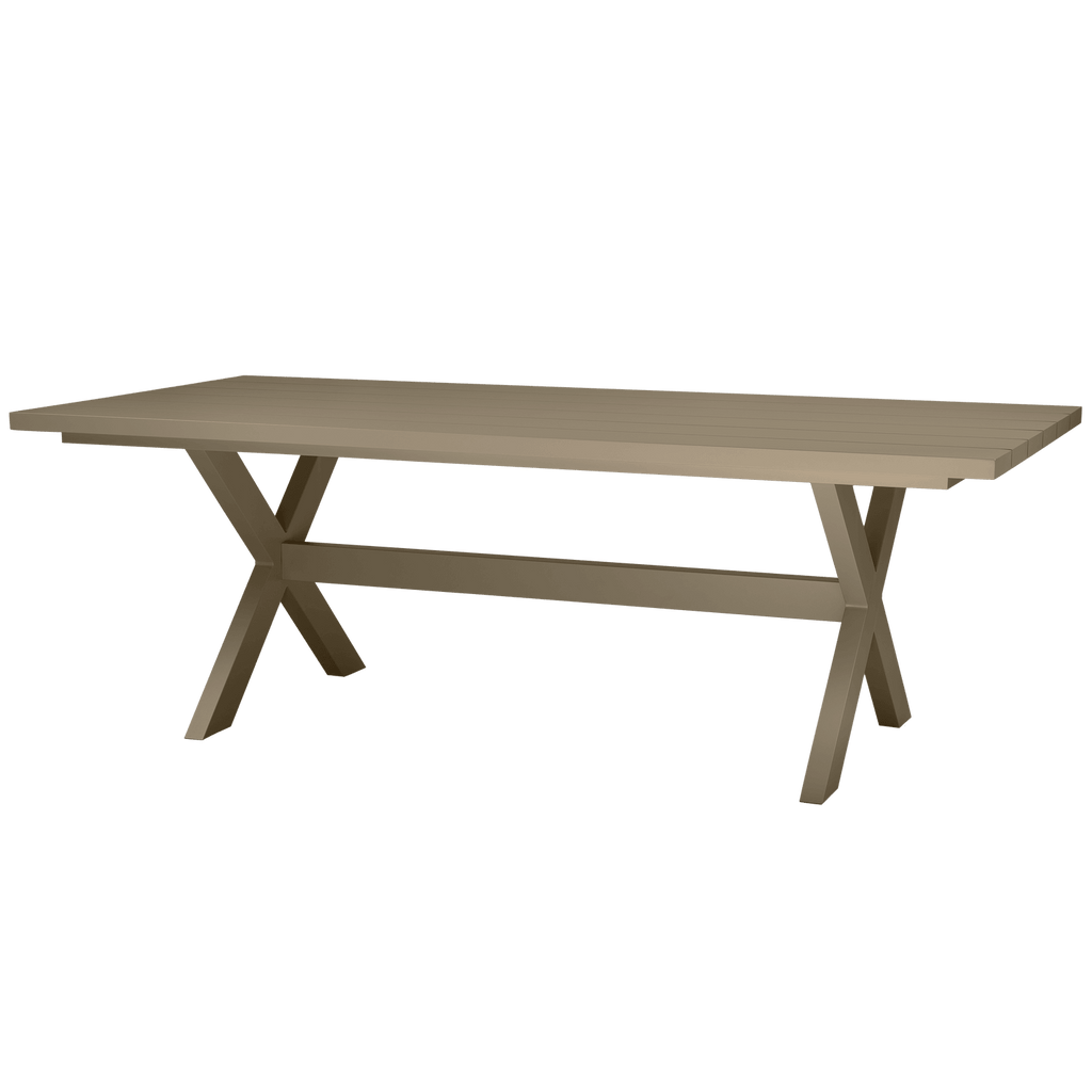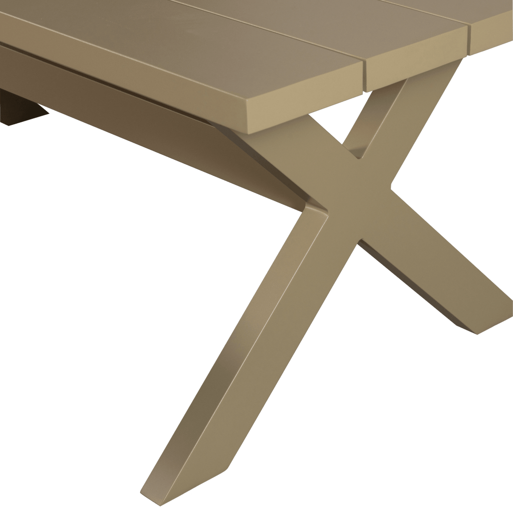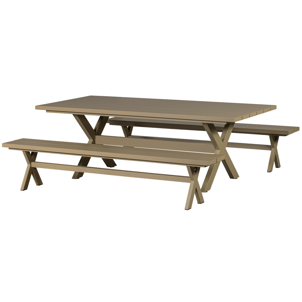 - Outdoor picnic table - Made of lightweight aluminium - Finished in a matt powder coating - H 75 cm x W 220 cm x D 105 cm A practical garden bench in lightweight aluminium. That's what you'll find in the Delta series by outdoor brand Exotan. The Delta picnic bench and picnic table are available separately and finished in a trendy coloured, matt powder coating. With the handy adjustable legs, Delta stands like a house! Outdoor Protect the furniture against hard rain, night frost and winter with a plastic film or protective cover. If possible, it is better to overwinter the furniture indoors. Material Aluminium is a very suitable type of metal for furniture development because of its light weight, strong composition and flexibility. The aluminium in our collections has various treatments and finishes, such as welding, stamping, powder coating or wet painting. This gives the aluminium item a chic look or even a weathered, aged look. Aluminium is anti-corrosive and therefore also very suitable for outdoor use. Dimensions - Height: 75 cm - Width: 220 cm - Depth: 105 cm - Table top thickness: 4 cm - Leg height: 71 cm - Leg thickness: 5 cm - Length of reinforcement beam: 140 cm - Spacing between floor/reinforcement beam: 32 cm - Load capacity: 150 kg - Weight: 46 kg Maintenance All aluminium items in the collection have been thoroughly treated and therefore do not require re-treatment. Should the aluminium be damaged, please consult a specialised paint shop. Treated aluminium is easy to keep clean with a slightly damp cloth and a mild detergent, drying the surface afterwards ensures a streak-free result. Delivery The article is delivered in one package with a minimum order of one piece. The article is easy to assemble using the supplied assembly instructions. For indoor use: to protect hard floors, place felt glides on the underside of the legs to prevent damage.