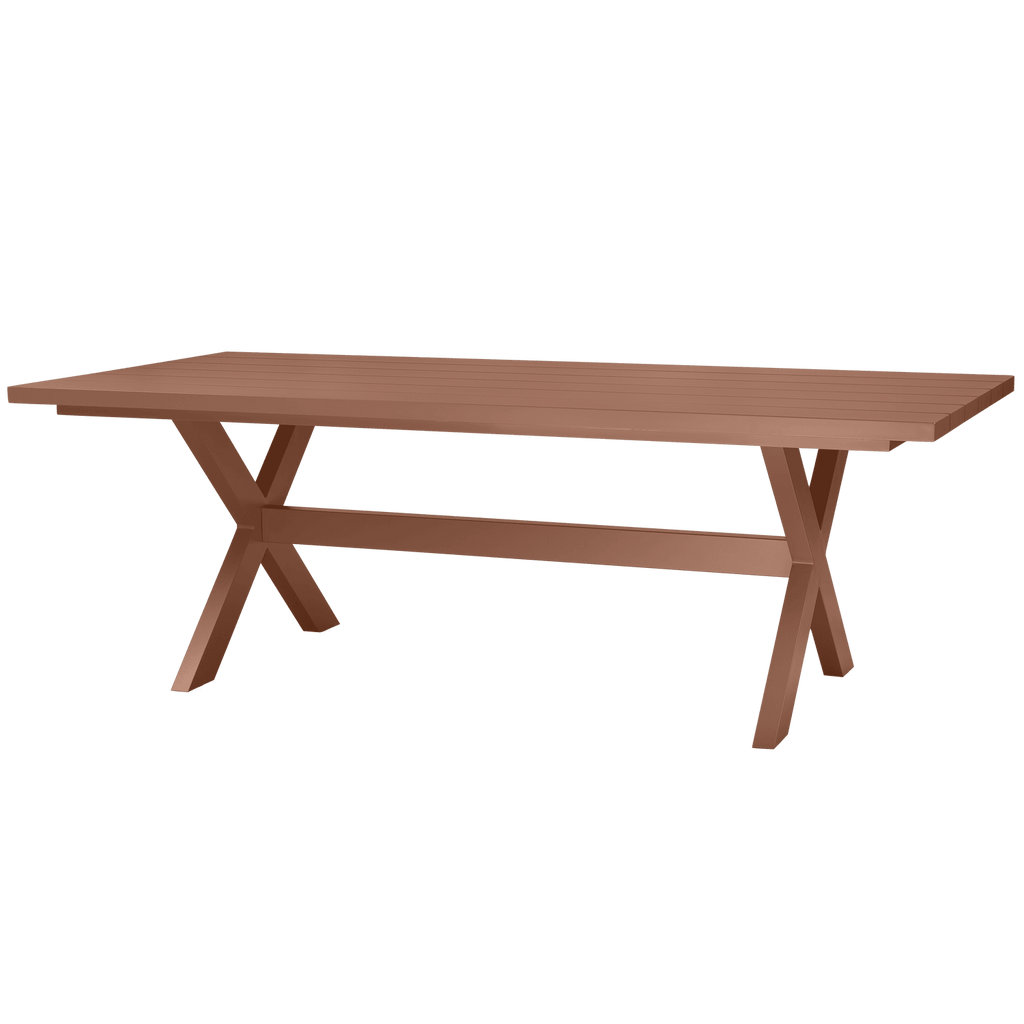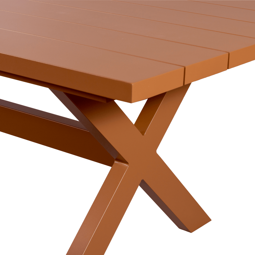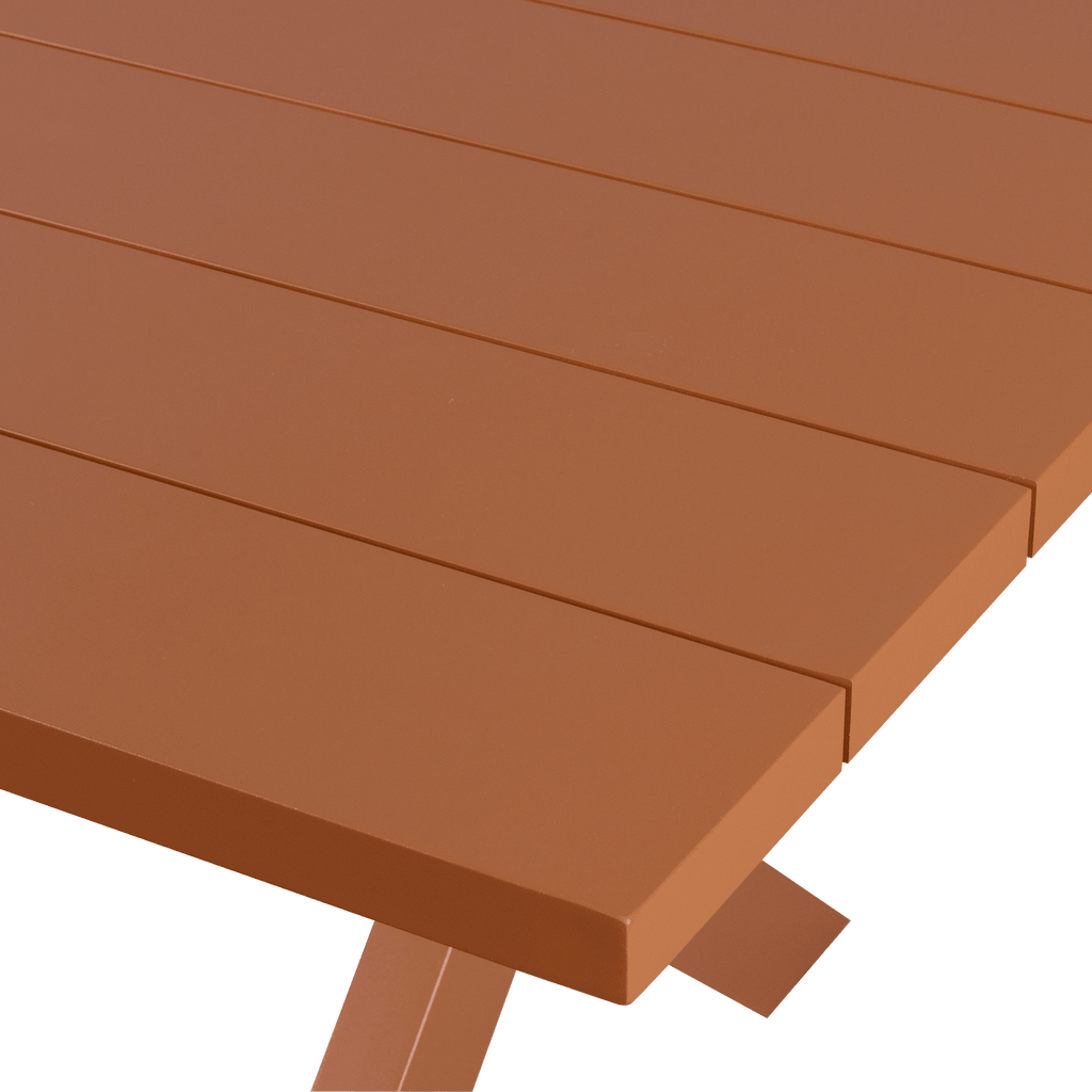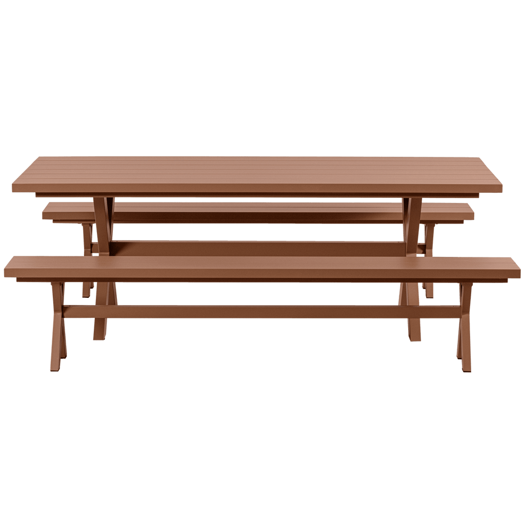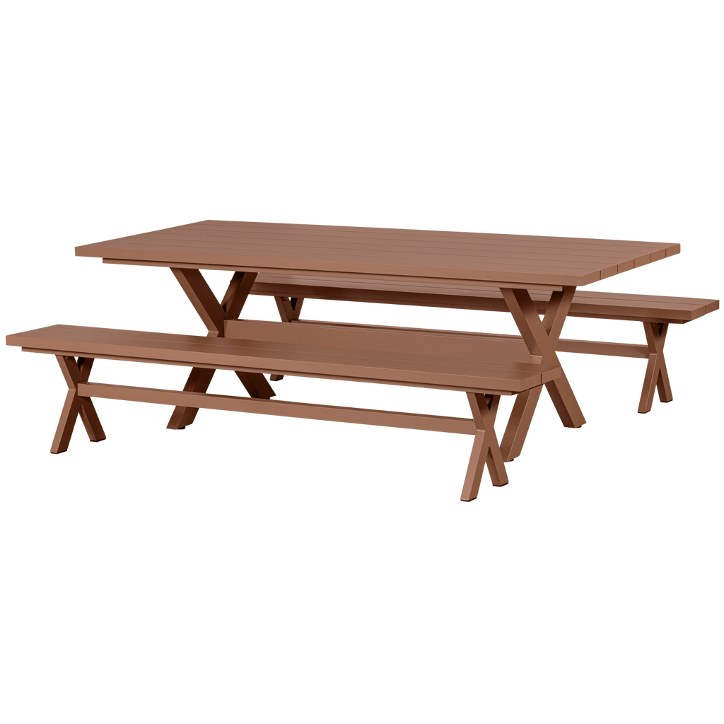 - Outdoor picnic table - Made of lightweight aluminium - Finished in a matt powder coating - H 75 cm x W 220 cm x D 105 cm A practical garden bench in lightweight aluminium. That's what you'll find in the Delta series by outdoor brand Exotan. The Delta picnic bench and picnic table are available separately and finished in a trendy coloured, matt powder coating. With the handy adjustable legs, Delta stands like a house! Outdoor Protect the furniture against hard rain, night frost and winter with a plastic film or protective cover. If possible, it is better to overwinter the furniture indoors. Material Aluminium is a very suitable type of metal for furniture development because of its light weight, strong composition and flexibility. The aluminium in our collections has various treatments and finishes, such as welding, stamping, powder coating or wet painting. This gives the aluminium item a chic look or even a weathered, aged look. Aluminium is anti-corrosive and therefore also very suitable for outdoor use. Dimensions - Height: 75 cm - Width: 220 cm - Depth: 105 cm - Table top thickness: 4 cm - Leg height: 71 cm - Leg thickness: 5 cm - Length of reinforcement beam: 140 cm - Spacing between floor/reinforcement beam: 32 cm - Load capacity: 150 kg - Weight: 46 kg Maintenance All aluminium items in the collection have been thoroughly treated and therefore do not require re-treatment. Should the aluminium be damaged, please consult a specialised paint shop. Treated aluminium is easy to keep clean with a slightly damp cloth and a mild detergent, drying the surface afterwards ensures a streak-free result. Delivery The article is delivered in one package with a minimum order of one piece. The article is easy to assemble using the supplied assembly instructions. For indoor use: to protect hard floors, place felt glides on the underside of the legs to prevent damage.