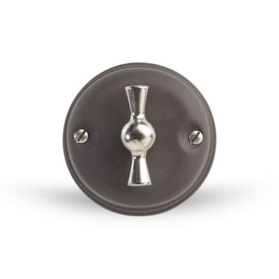 Întrerupător din seria Ardesia GI Gambarelli din crom, finisaj antracit, crom model clasic cu buton rotativ. Piesă artizanală fabricată în Italia, concepută pentru instalații electrice aparente. Compatibil cu rozetele, izolatorii și cablurile din gama GI Gambarelli. Design clasic italian care transformă elementele funcționale în obiecte decorative.
