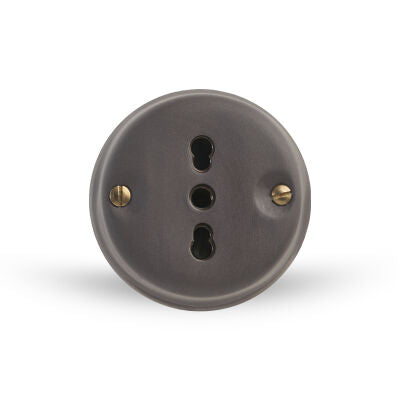 Priză GI Gambarelli din seria Ardesia din porțelan, finisaj antracit. Piesă artizanală fabricată în Italia, concepută pentru instalații electrice aparente de tip vintage sau retro. Compatibilă cu toate componentele din gama GI Gambarelli. Montaj pe rozetă sau direct pe perete.