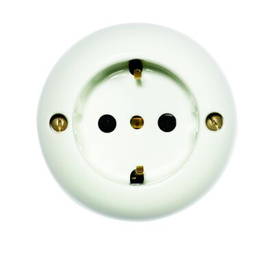 Priză GI Gambarelli din portelan, finisaj alb. Piesă artizanală fabricată în Italia, concepută pentru instalații electrice aparente de tip vintage sau retro. Compatibilă cu toate componentele din gama GI Gambarelli. Montaj pe rozetă sau direct pe perete.
