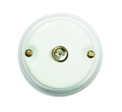 Priză GI Gambarelli din portelan, finisaj alb. Piesă artizanală fabricată în Italia, concepută pentru instalații electrice aparente de tip vintage sau retro. Compatibilă cu toate componentele din gama GI Gambarelli. Montaj pe rozetă sau direct pe perete.