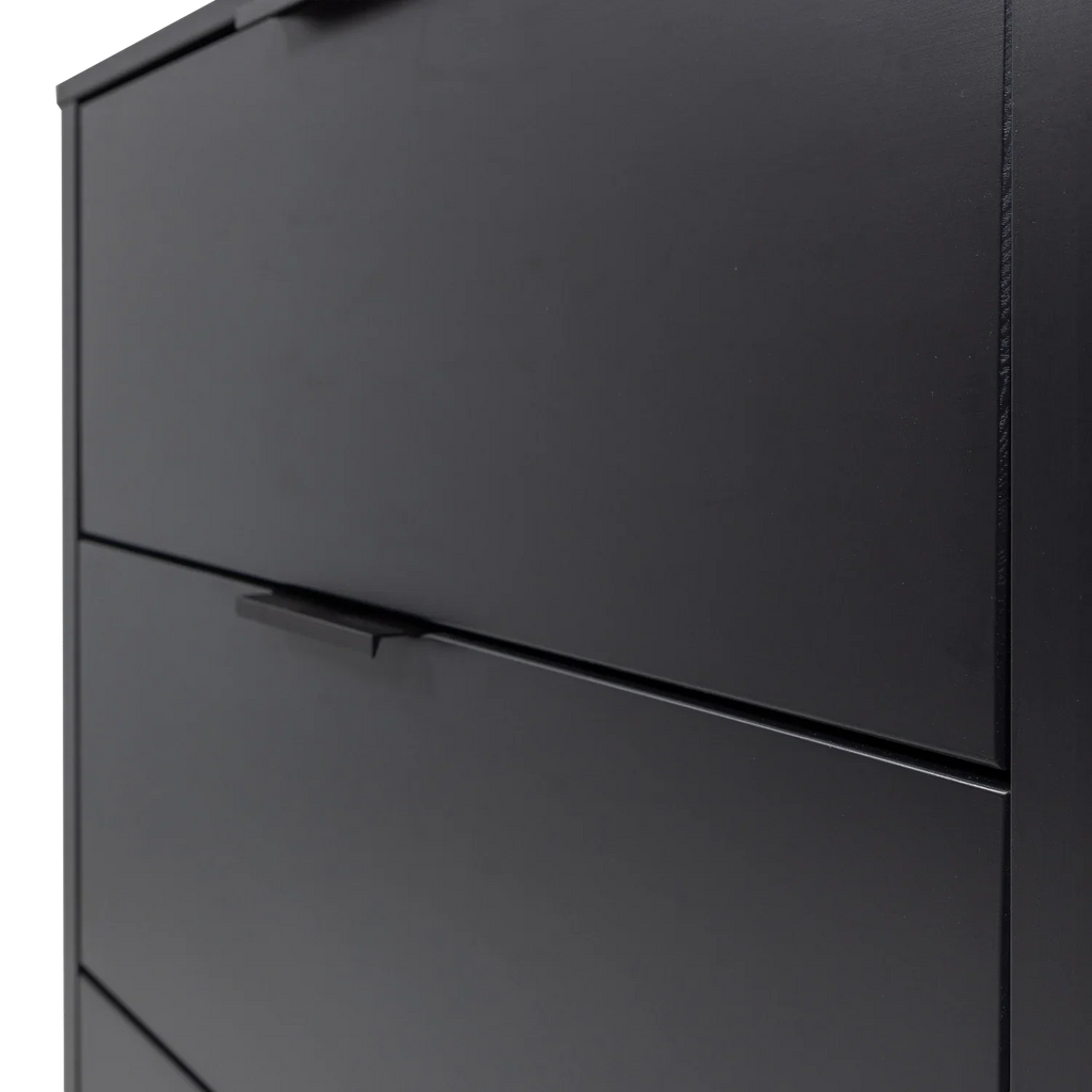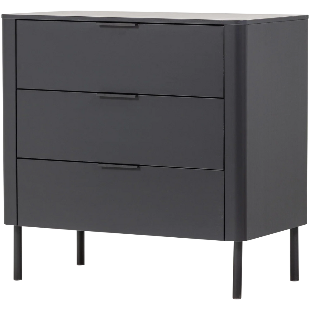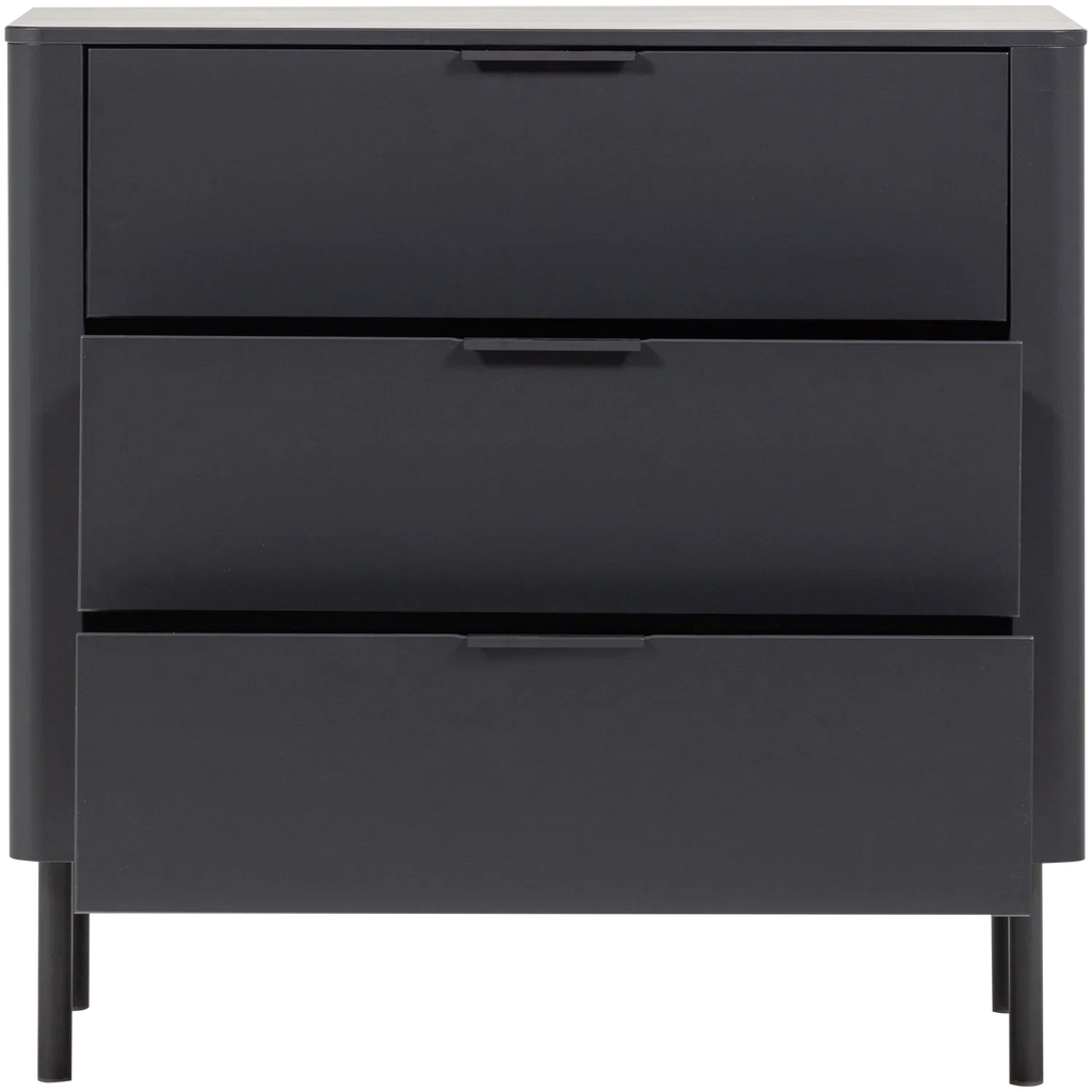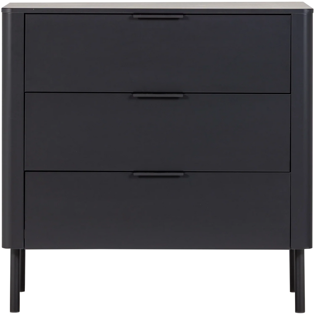 - Modern chest of drawers with timeless design - Made from FSC Mix-certified pine wood - Finished in a matte black color - H 93 cm x W 94 cm x D 52 cm The Gunnar chest of drawers from Dutch interior brand WOOOD offers a stylish solution for extra storage space. The three spacious drawers with soft-close closure and subtle handles make it easy to store clothes or accessories. Thanks to its rounded corners, modern finish, and matte lacquer, the chest of drawers is not only functional but also an addition to any interior. The Gunnar chest of drawers is made of solid pine and has a timeless look. Material The pine furniture in our collections is FSC Mix certified and treated in various ways. For example, the pine material is sanded and finished with a beautiful, opaque lacquer. Pine wood is characterized by visible flame and grain patterns. Dimensions - Height: 93 cm - Width: 94 cm - Depth: 52 cm - Leg height: 20 cm - Shelf thickness: 1.5 cm - Weight capacity per drawer: 15 kg (distributed load) - Weight: 30.5 kg Maintenance The pine wood items in our collections are treated with an environmentally friendly, water-based varnish, which significantly extends the product's lifespan. Treated pine wood is easy to keep clean with a slightly damp cloth. To avoid rings and stains in the wood, it is recommended to dry damp spots immediately. Stable and safe use For cabinets taller than 50 cm, we recommend paying extra attention to wall mounting. Installing fall prevention prevents accidents and keeps the cabinet from tipping over. Delivery This piece of furniture is delivered in two packages and is easy to assemble using the supplied assembly instructions. To protect hard floors, place felt glides on the underside of the legs. Take extra care when installing the fall protection to prevent accidents.