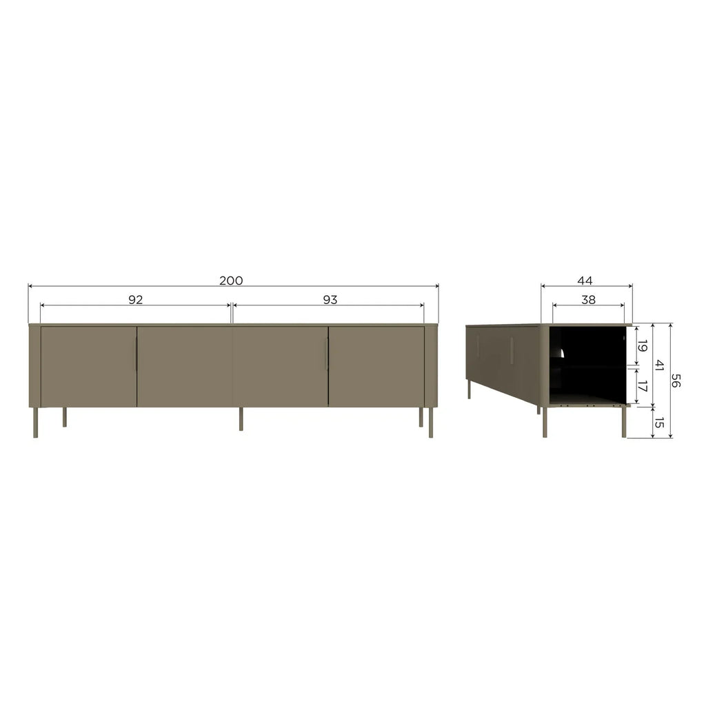 - Generous TV cabinet with timeless design - Molded from FSC-certified pine wood - Finished in a matte mud color - H 56 cm x W 154 cm x D 44 cm Sleek and modern, these are the characteristics of the Gunnar TV cabinet, from Dutch interior design brand WOOOD. Store your accessories safely behind one of the four doors and enjoy an evening of TV watching on the sofa. An added bonus: you can choose whether to hang the unit on the wall or place it on the floor. This spacious TV cabinet has a matte mud-colored finish and is a stylish addition to your interior! Material The pine furniture in our collections is FSC-certified and is treated in various ways. For example, sanded pine is smooth and neatly finished and brushed pine, on the other hand, is known for its characteristic grain marks and lived-in look. For an even more robust look, pine is band sawn. Pine is characterized by visible flame and grain marks. Dimensions - Height: 56 cm - Width: 154 cm - Depth: 44 cm - Foot height: 15 cm - Shelf thickness: 1.5 cm - Weight per shelf: 10 kg - Weight: 24 kg Maintenance The pine items in our collections are treated with an environmentally friendly, water-based lacquer which significantly extends the life of the product. Treated pine wood is easy to keep clean with a slightly damp cloth. To avoid rings and spots in the wood, it is recommended to dry damp stains immediately. Stable and safe use For cabinets taller than 50 cm, we recommend paying extra attention to wall mounting. Fall prevention mounting prevents accidents and preserves the cabinet from tipping over. Delivery This furniture comes in two packages and is easy to assemble using the included assembly instructions. To protect hard floors, place felt glides on the underside of the legs.