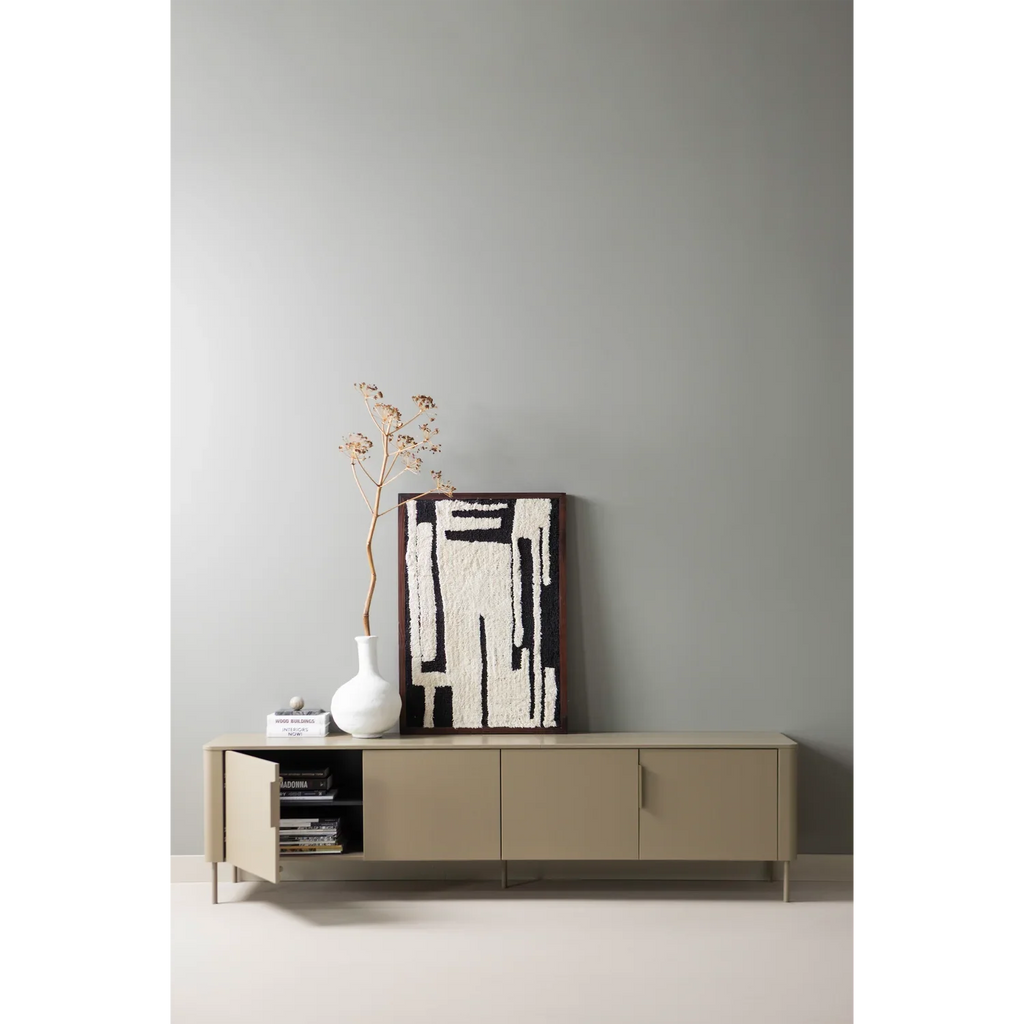 - Generous TV cabinet with timeless design - Molded from FSC-certified pine wood - Finished in a matte black color - H 56 cm x W 200 cm x D 44 cm Sleek and modern, these are the characteristics of the Gunnar TV cabinet, from Dutch interior design brand WOOOD. Store your accessories safely behind one of the four doors and enjoy an evening watching TV on the couch. This spacious TV cabinet has a matte finish and is a stylish addition to your interior! Material The pine furniture in our collections is FSC-certified and is treated in various ways. For example, sanded pine is smooth and neatly finished and brushed pine, on the other hand, is known for its characteristic grain marks and lived-in look. For an even more robust look, pine is band sawn. Pine is characterized by visible flame and grain marks. Dimensions - Height: 56 cm - Width: 200 cm - Depth: 44 cm - Foot height: 15 cm - Shelf thickness: 1.5 cm - Weight per shelf: 10 kg - Weight per shelf: 29,7 kg Maintenance The pine items in our collections are treated with an environmentally friendly, water-based lacquer which significantly extends the life of the product. Treated pine wood is easy to keep clean with a slightly damp cloth. To avoid rings and spots in the wood, it is recommended to dry damp stains immediately. Stable and safe use For cabinets taller than 50 cm, we recommend paying extra attention to wall mounting. Fall prevention mounting prevents accidents and preserves the cabinet from tipping over. Delivery This furniture comes in two packages and is easy to assemble using the included assembly instructions. To protect hard floors, place felt glides on the underside of the legs.