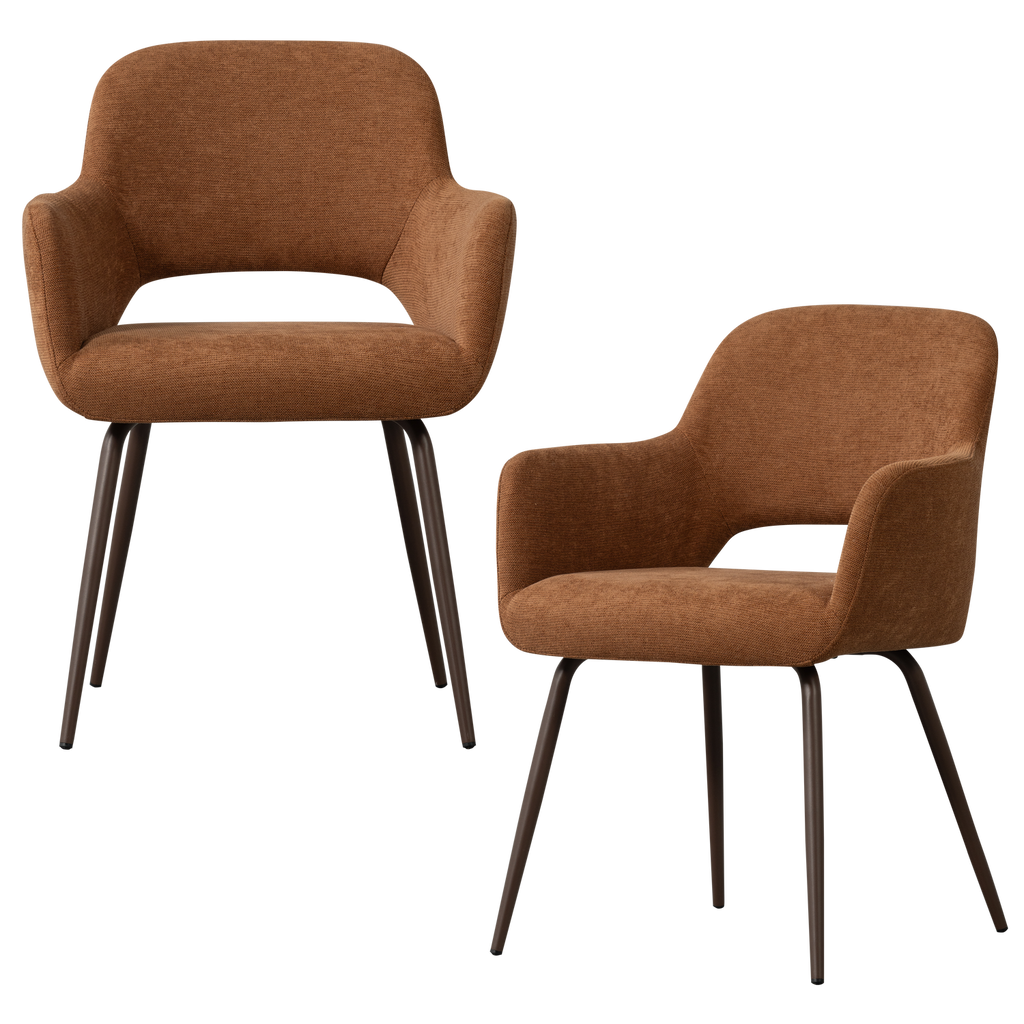 - Trendy dining chair Jenny - Upholstery in woven fabric (100% PES) - Comfortable seat - H 80 cm x W 58 cm x D 58 cm The Jenny dining chair has a comfortable seat and is a very pleasant addition to the dining area. Jenny belongs to the collection of Dutch interior design brand WOOOD. The rounded finishes and back support give the chair great comfort. This allows you to enjoy hours of dining with the Jenny! Material Our Hope woven fabric has a soft feel and is striking for its subtle colour nuances. This flat woven fabric is made of 100% polyester and has an even, compact weave pattern. The Hope woven fabric has a Martindale 50,000, and is suitable for fairly intensive residential use. Dimensions - Height: 80 cm - Width: 58 cm - Depth: 58 cm - Seat height: 47 cm - Seat width: 42 cm - Seat depth: 45 cm - Armrest height: 25 cm - Armrest width: 7 cm - Armrest depth: 32 cm - Backrest height: 28 cm - Height of intermediate section of backrest: 9 cm - Foot height: 41 cm - Leg thickness: 3 cm - Leg spacing inside front: 45 cm - Space between legs inside rear: 45 cm - Space between legs inside side: 47 cm - Capacity: 100 kg - Weight: 7 kg Maintenance The woven fabric is easy to maintain, remove stains easily with a slightly damp cloth and a neutral detergent. When the fabric can be removed from the furniture, it can be washed at 30 degrees. It is recommended to wash covers inside out in the washing machine whenever possible. Delivery The article is delivered in pairs with a minimum purchase of two pieces. The article is easy to assemble using the supplied assembly instructions. To protect hard floors, place felt glides on the underside of the leg to prevent damage.