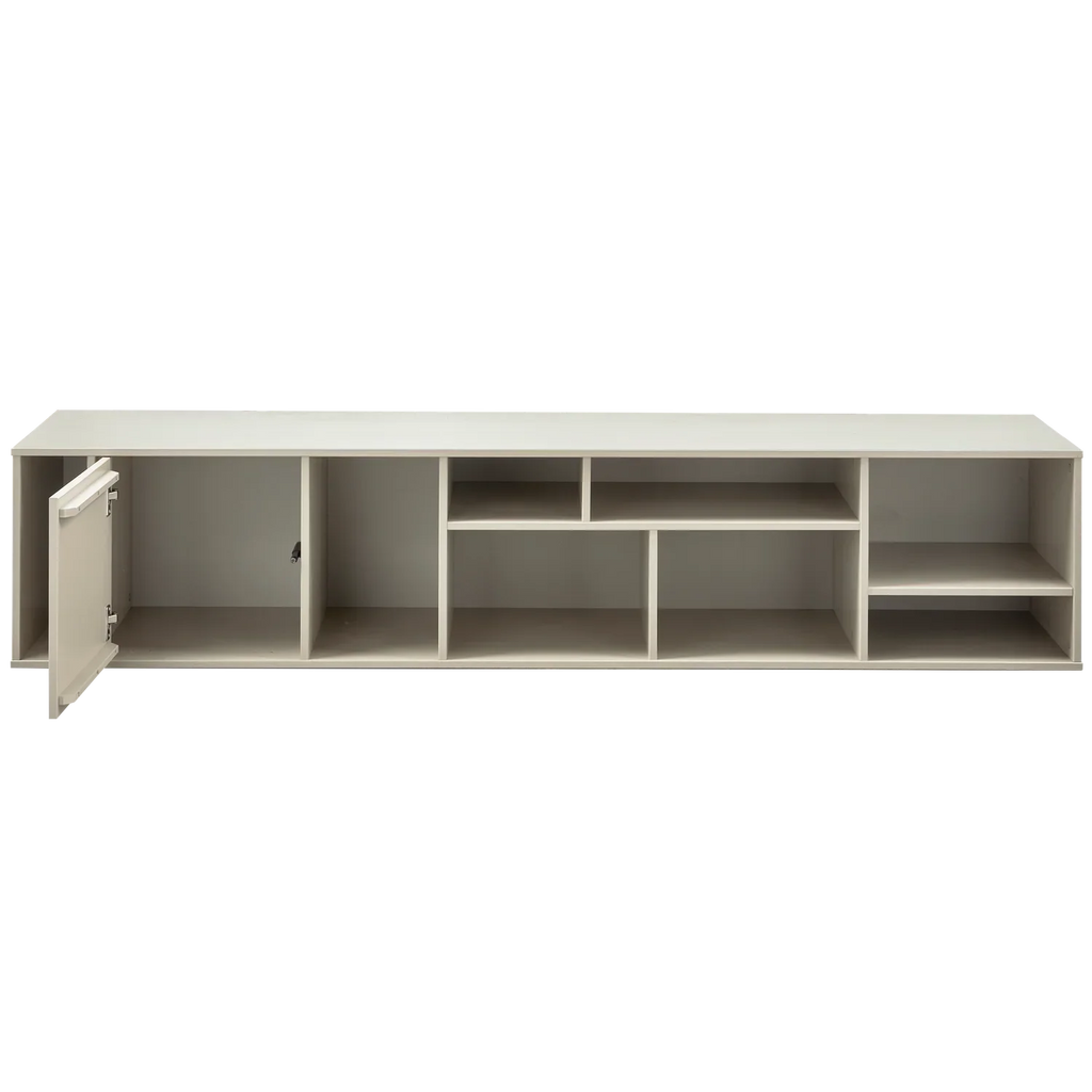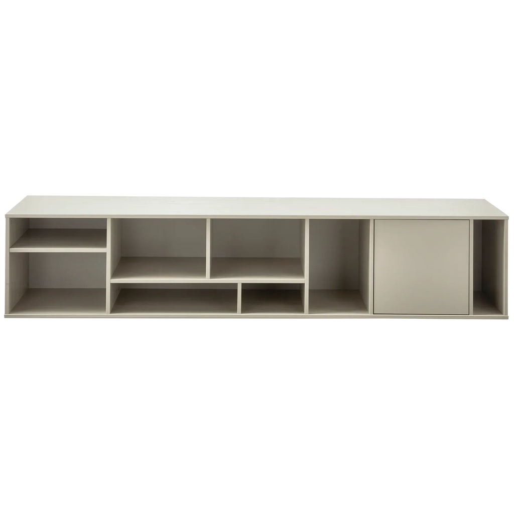 - Playful, multifunctional wall unit - Made of FSC-certified pine wood - Finished in matte color: dust - H 40 cm x W 194 cm x D 40 cm The Letterba(n)k wall unit is a playful and multifunctional piece from the collection of Dutch interior design brand vtwonen. With the combination of various sizes of open compartments, one of which is closed with a push-to-open door, the wall unit is easy to arrange as you wish. Whether you attach it horizontally or vertically to the wall; everything is possible! This gives you 4 different looks in one piece of wall furniture. Material The pine furniture in our collections is FSC-certified and is treated in various ways. For example, sanded pine is smooth and neatly finished, but knots and the wood structure remain visible. Brushed pine, on the other hand, is known for its characteristic grain marks and aged look. For an even more robust look, pine is band sawn. Pine is characterized by visible flame and grain marks. Dimensions - Height: 40 cm - Width: 194 cm - Depth: 40 cm - Contents closed compartment: H 37 cm x W 37 cm, push to open system - Weight 27 kg Maintenance The pine items in our collections are treated with an environmentally friendly, water-based lacquer which significantly extends the life of the product. Treated pine is easy to keep clean with a slightly damp cloth. To avoid circles and spots in the wood, it is recommended to dry damp stains immediately. Delivery The furniture is delivered in one package. The item is easy to assemble using the clear assembly instructions. Using the included support slats you will hang the wall unit on the wall. Please note: the instructions indicate which support slats you should use for horizontal or vertical use!