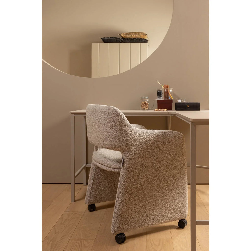 - Modern dining chair on castors with fixed seat - Upholstered with Ceyo boucle blend fabric (100% PES) - Upholstered from head to toe - H 79 cm x W 59 cm x D 58 cm The Lyric dining chair comes from the collection of the Dutch brand WOOOD and has a comfortable seat. The castors make the chair easy to move. The upholstered legs give the chair a very luxurious and unique look. This dining chair is upholstered in a woven fabric (100% polyester) with melange. A stylish and comfortable addition to your dining table. Material Our luxurious boucle fabric Ceyo has a warm, woolly texture that instantly adds coziness to any room. The boucle fabric with a Martindale of 30,000 is suitable for intensive use at home. The fabric is made of 100% polyester and is given extra depth by the color mix and the unique weaving technique with uneven loops, creating a rich and vibrant 3D effect. Dimensions - Height: 79 cm - Width: 59 cm - Depth: 58 cm - Seat height: 48 cm - Seat width: 44 cm - Seat depth: 42 cm - Leg height: 40 cm - Diameter legs: 5 cm - Width between legs front: 57 cm - Width between legs side: 45 cm - Backrest height: 35 cm - Height back from ground: 81 cm - Armrest height from ground: 65 cm - Armrest width: 5 cm - Weight: 12 kg - Max. load weight: 120 kg Maintenance Dab any stains dry immediately with a clean cloth or tissue. Do not rub! Most liquids can be removed with lukewarm water. Use a gentle circular motion from the outside inwards. If the fabric can be removed, it is possible to wash it at up to 30 degrees. Stain Protection: For long-term protection against stains, the fabric can be impregnated. When using impregnation, the fabric can be treated with the brand iProteqt for optimal protection. This textile protector ensures that the furniture fabric is resistant to liquids based on oil, water and grease. It is recommended to do this as soon as possible after receipt to ensure instant protection. Delivery The item is delivered individually and fully assembled.