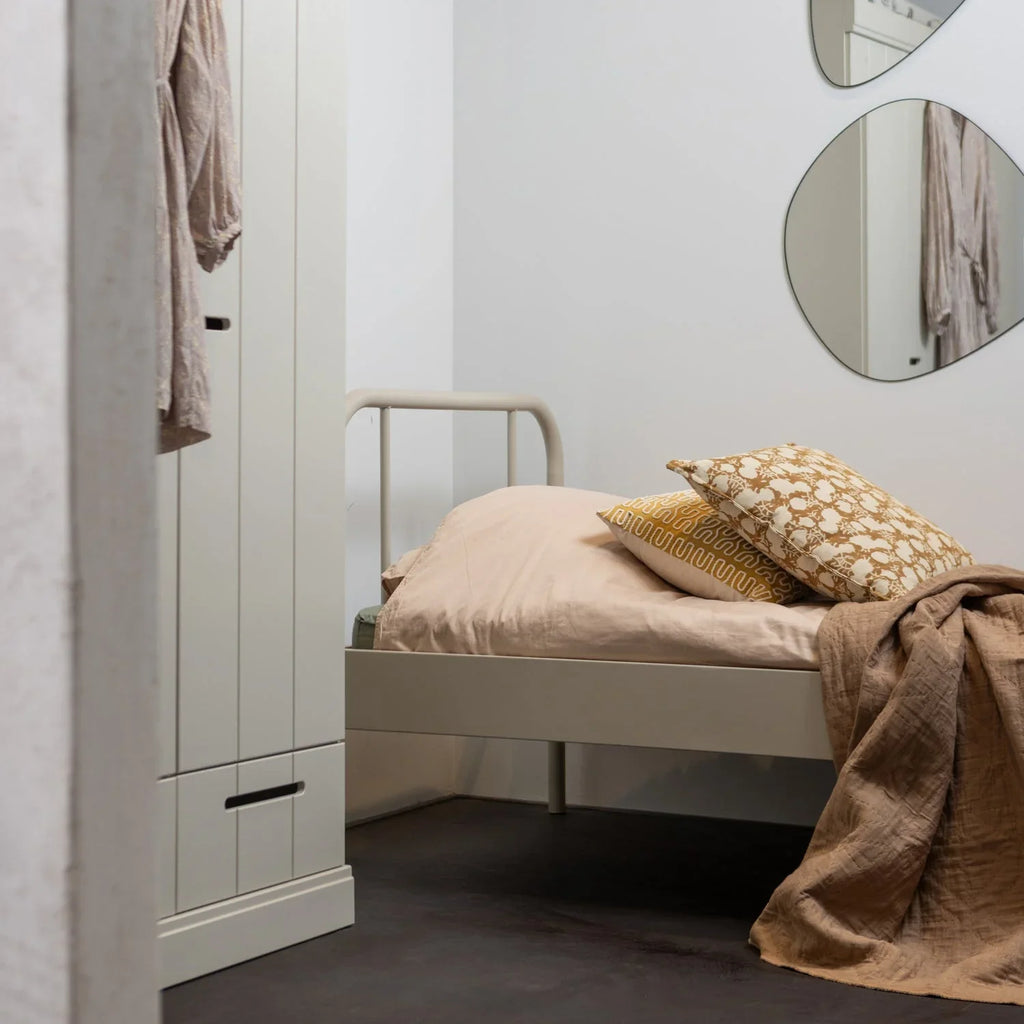 - Modern children's bed - Steel frame with sand-colored powder coating - Exclusive mattress - H 90 x W 208 x H 95 The Mata single bed is from the collection of the Dutch brand WOOOD and has a timeless and stylish look. The single bed is a real asset to any nursery! The frame is made of steel and finished with a sand-colored powder coating. The bed Mata is suitable for a mattress of 90x200 cm. The bed is delivered without mattress. Material Powder-coated metals provide a luxurious look and are protected for life. A powder coating is a paint that is attached to the metal using high temperatures. A powder coating ensures full color coverage and has a matte or (slightly) glossy finish. Dimensions - Height: 90 cm - Width: 208 cm - Depth: 95 cm - Height of headboard from edge of bed: 49 cm - Height of footboard from edge of bed: 28 cm - Thickness of bed edge: 14 cm - Foot height to bottom edge of bed: 28 cm -Foot diameter: 4 cm - Weight: 20.5 kg Maintenance All our metals in the collection are thoroughly treated and thus do not require re-treatment. Treated metal is one easy to keep clean with a slightly damp cloth, drying the surface afterwards ensures a streak-free result. Delivery The item is delivered in 2 packages. The item is easy to assemble using the clear assembly instructions. Place felt glides at the bottom to protect hard floors.