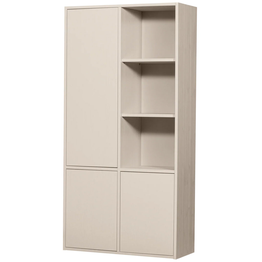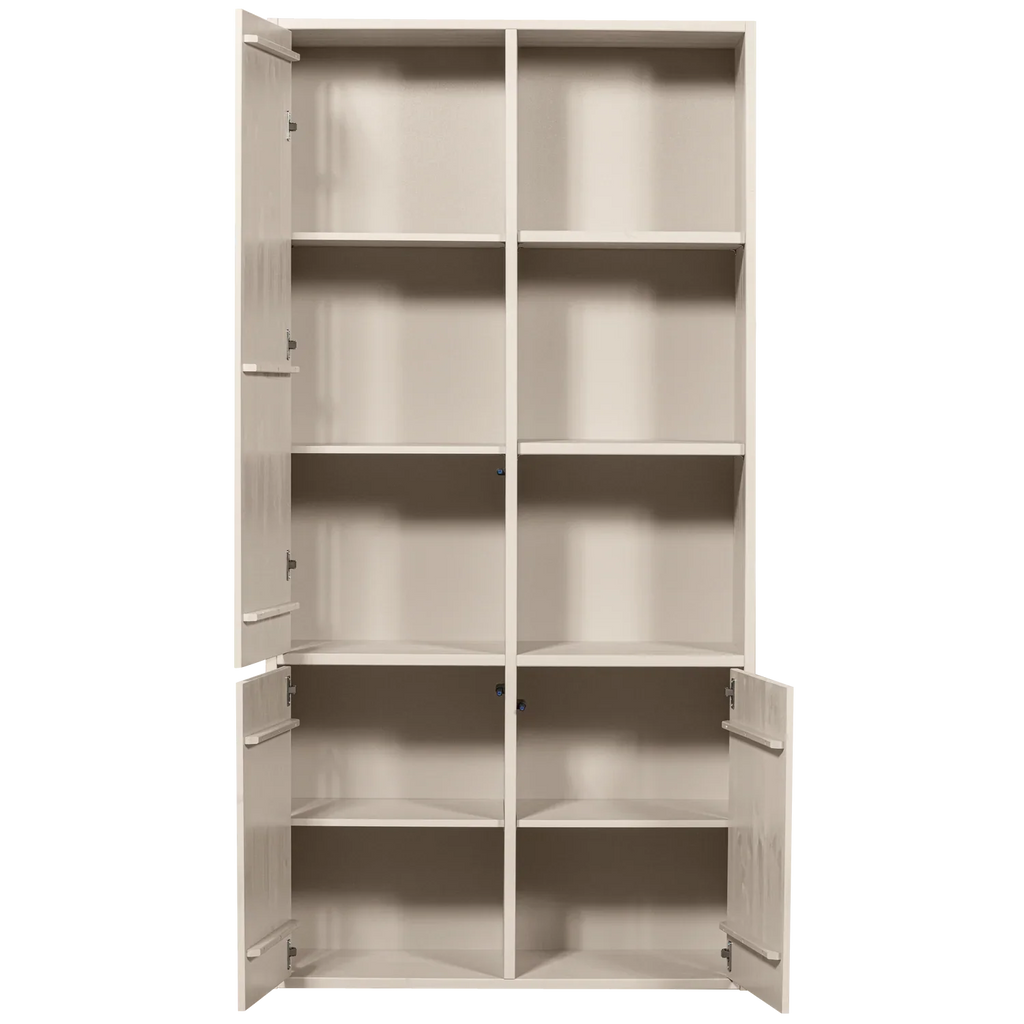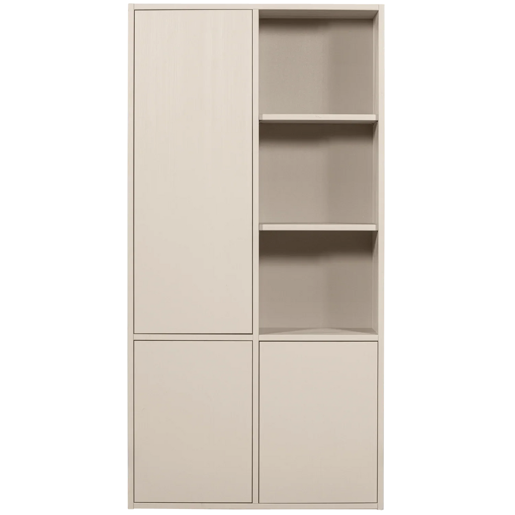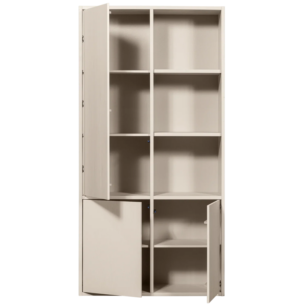 - With modern push-to-open system - Equipped with plenty of storage space - Made of pine - H 200 cm x W 100 cm x D 39.5 cm Stylish, timeless and modern. Those are the telling keywords of the Merel storage cupboard. Merel is from the collection of Dutch interior design label WOOOD and is made of natural pine. On the upper right side of the Merel cabinet are two pine boards. The plates behind the doors are made of particleboard. The clean lines of the Merel storage cabinet are not interrupted by handles, with a modern push-to-open system the doors open and close silently. Material The pine furniture in our collections is FSC-certified and is treated in various ways. For example, sanded pine is smooth and neatly finished, while brushed pine is known for its lived-in look. For a more robust look, pine is band sawn. Dimensions - Height: 200 cm - Width: 100 cm - Depth: 39.5 cm - Top cupboard dimensions: H 41 cm x W 46.5 x D 37.5 cm - Dimensions bottom sideboard compartments: H 31.6 cm x W 46.5 cm x D 37.5 cm - Max load per shelf: 10 kg evenly distributed - Weight: 64 cm Maintenance The pine items in our collections are treated with an environmentally friendly, water-based lacquer which significantly extends the life of the product. Treated pine is easy to keep clean with a slightly damp cloth. To avoid circles and spots in the wood, it is recommended to dry damp stains immediately. Stable and safe use For cabinets taller than 50 cm, we recommend paying extra attention to the wall mounting. Installing fall prevention prevents accidents and keeps the cabinet from tipping over. Delivery The item comes in three packages and is easy to assemble using the assembly instructions provided. To protect hard floors, place felt glides on the underside of the legs.