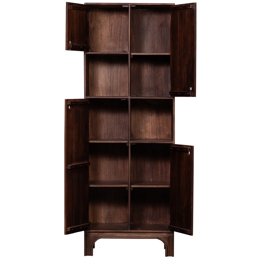 - Classic storage cabinet - Made of mango wood with a walnut finish - Authentic due to visible grain and colour nuances - H 210 cm x W 75 cm x D 45 cm The playful lines in the base and the mango wood with walnut finish make the Staes storage cabinet a classic, atmospheric addition to the interior. The storage cabinet belongs to the collection of Dutch interior design brand WOOOD and features four closed doors for storing things. The grains and knots in the mango wood make the Staes storage cabinet an authentic item. WARNING tipping hazard! For furniture higher than 50 cm, we recommend paying extra attention to the wall mounting. Fall prevention mounting prevents accidents and preserves the furniture from tipping over. Material Mango wood is known for its warm golden brown colour, durable growth and long durability. Mango wood is also characterised by clearly visible grain and colour nuances. The grain, a yellow glow or dark lines and knots ensure that each mango wood item is unique. Mango wood is very strong and one of the harder woods, so a mango wood item will not easily be damaged. Dimensions - Height: 210 cm - Width: 75 cm - Depth: 45 cm - Weight per shelf: 10 kg - Weight: 58 kg Maintenance Mango wood furniture is easy to maintain. You can easily keep them dust- and stain-free with a slightly damp, clean cloth. Mango-wood items are intended for indoor use only. Additional treatment or protection is possible with a transparent coating, but is not considered necessary for the first few years. Always consult a paint specialist for advice and information regarding treating the mango wood item. Delivery The item is delivered in one package, fully assembled. To protect hard floors, place felt glides under the legs.
